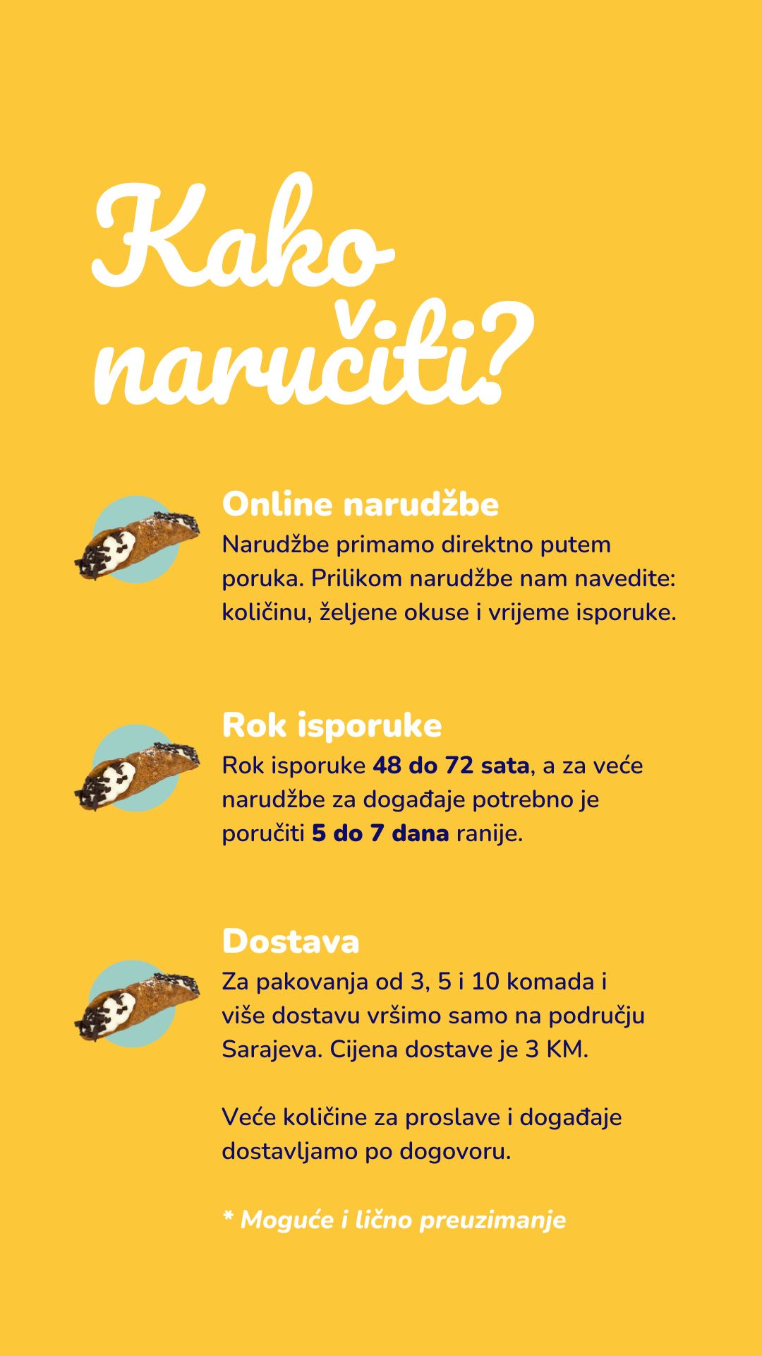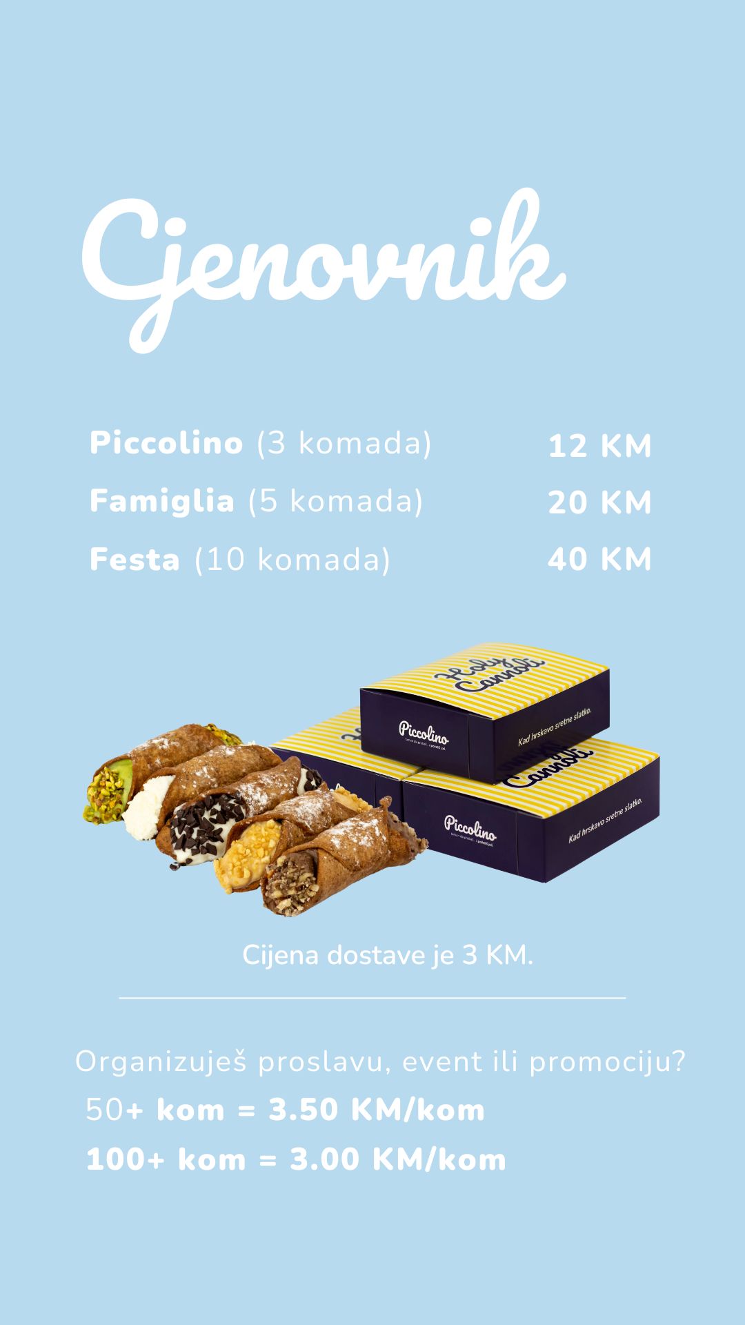 Pravimo autentične sicilijanske cannole, ručno pripremljene i svježe punjene. Hrskava školjka, kremasto srce i pažljivo birani sastojci čine svaki zalogaj malim ritualom uživanja. Mi ne pravimo samo slatkiše, već osjećaj – kao da ste upravo prošetali uskim ulicama Palerma.